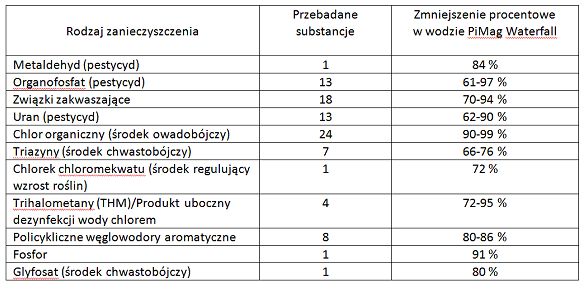 Instytucje odpowiedzialne za kontrolę jakości wody przeprowadzają regularnie badania zawartości metali w wodzie, w celu upewnienia się, iż nie przekraczają one dopuszczalnych poziomów. (Termin stosowany w Wielkiej Brytanii – Prescribed Concentration or Value, czyli Dopuszczalne Stężenie lub Poziom). Wykazano zmniejszenie stężenia następujących zanieczyszczeń w wodzie kranowej z Wielkiej Brytanii, którą poddano procesowi filtracji w urządzeniu PiMag Waterfall: