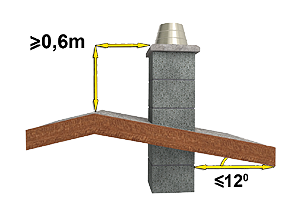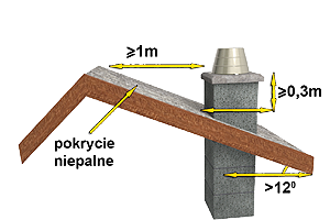 - przy dachach stromych o kącie pochylenia połaci większym niż 12° i pokryciu niepalnym, wyloty przewodów powinny znajdować się co najmniej o 0,30 m od powierzchni dachu w odległości co najmniej 1,0 m mierzonej w kierunku poziomym od tej powierzchni:
