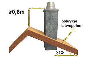 - przy dachach stromych o kącie większym niż 12° i pokryciu łatwopalnym – co najmniej 0,60 m wyżej od poziomu kalenicy: