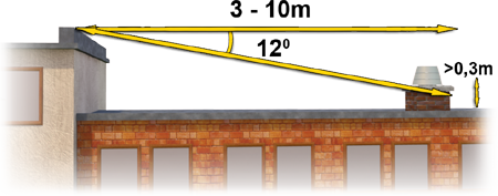 3. Ponad płaszczyzną wyprowadzoną pod kątem 12° w dół od poziomu przeszkody dla kominów usytuowanych w odległości od 3,0 do 10 m od tej przeszkody.